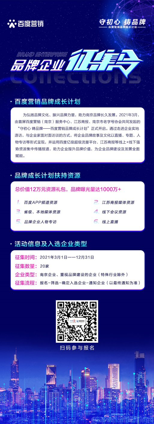 百度從傳統(tǒng)的網(wǎng)絡(luò)搜索引擎到移動互聯(lián)網(wǎng)時代的深度布局,正以技術(shù)推動創(chuàng)新,以AI人工智能深度賦能城市建設(shè)、產(chǎn)業(yè)升級以及品牌新競爭等價值升維。在智能經(jīng)濟(jì)發(fā)展的宏觀大環(huán)境下,百度將積極求新求變、加速升級迭代,用技術(shù)驅(qū)動商業(yè)增長,創(chuàng)新加速品牌成長,助力社會經(jīng)濟(jì)發(fā)展新勢頭?!鞍俣葼I銷品牌計劃”第二期正面向廣大品牌企業(yè)進(jìn)行征集,有興趣的品牌企業(yè)可掃描下方報名二維碼參與,期待有更多的品牌企業(yè)加入到活動中,展現(xiàn)品牌活力、書寫品牌榮耀。